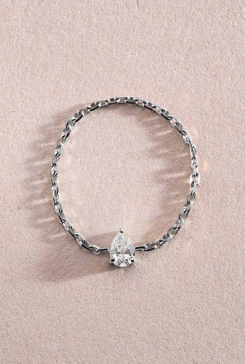 El anillo de cadena alta vestirá su mano con una ligereza incomparable, cada movimiento irá acompañado de un toque de brillo. El brillo proviene del diamante en forma de pera de 0.10 quilates montado en una garra en oro blanco. El diamante se sujeta alrededor del dedo gracias a una cadena fina y delicada pero muy fuerte de oro blanco. Este anillo ideal para ofrecer satisfará a la persona que lo usa gracias al brillo del diamante.
