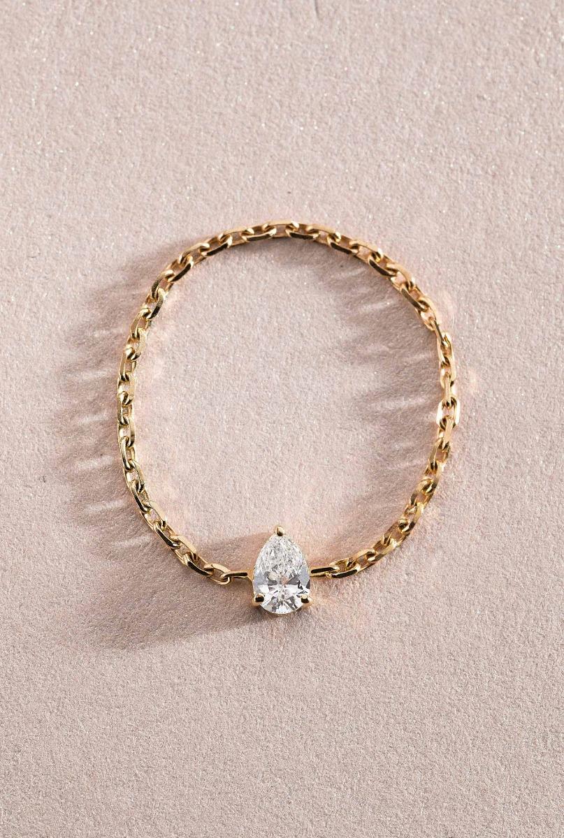Este anillo combina comodidad, resistencia, pero también clase y elegancia, gracias a su hermoso diamante en forma de pera de 0.10 quilates, este anillo brillará mil luces alrededor de su dedo. El diamante está en el centro de una cadena fina pero fuerte de oro amarillo, lo que hace que el anillo sea aún más brillante. Ella sabe ser discreta en la vida cotidiana gracias a la delicadeza de la cadena que no sentirás en tus dedos.
