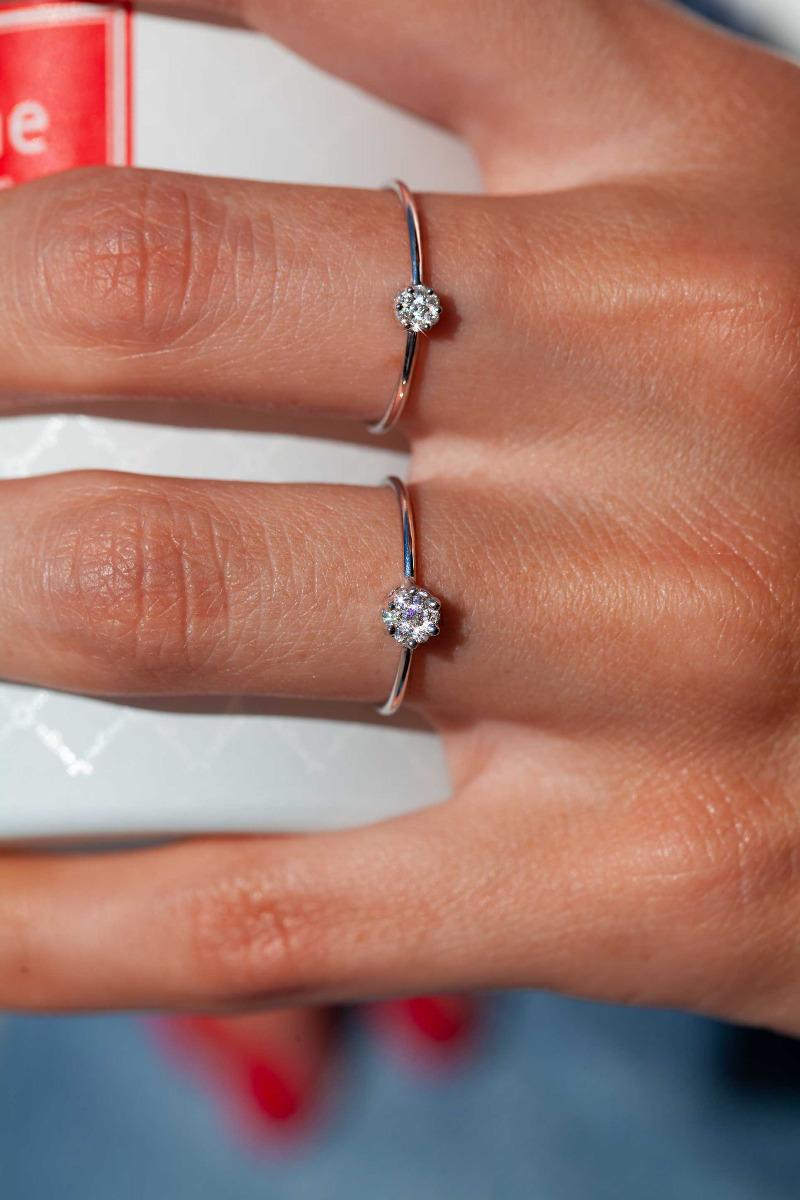 Este seductor anillo minimalista une siete diamantes engastados en una garra de "Ilusión" y una delicada banda de oro. Disponible en tres colores de oro.