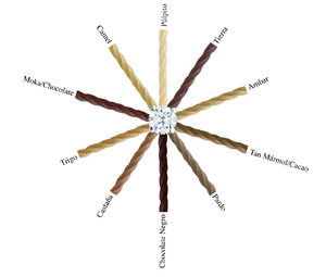 En Orden de izquierda a derecha: Ámbar – Trigo – Chocolate Negro – Moka/Chocolate – Mármol/Cacao – Tierra – Chocolate – Carne -Mármol/Cacao – Hilo Castaña.