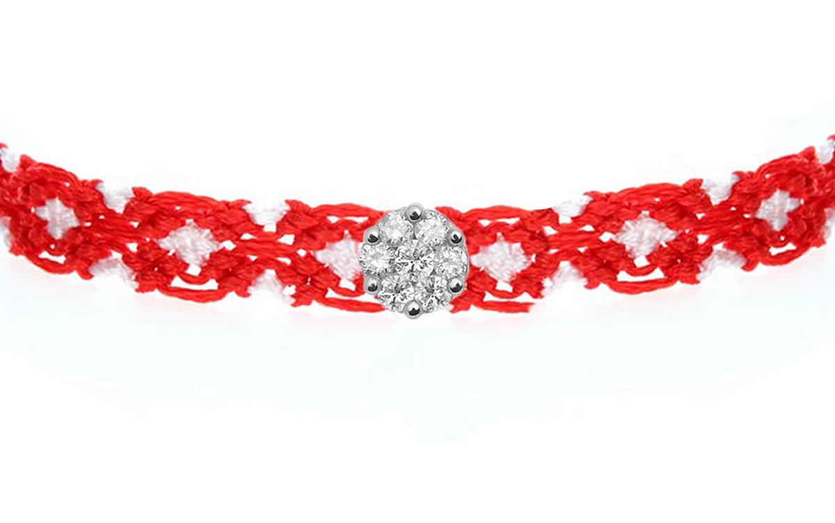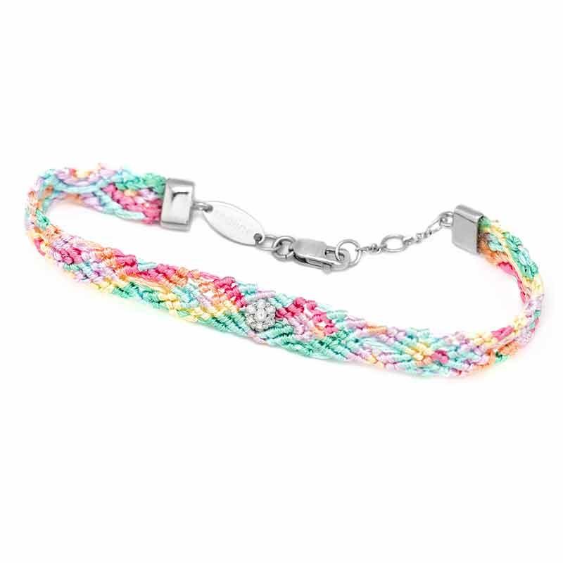 La pulsera brasileña que acompañó tus vacaciones, se renueva con un hermoso diamante llusion (siete diamantes que suman en total 0.05 quilates) montados sobre una garra engastada en oro y acompañado de un broche y tres anillos de oro 18k par ajustar a la perfección tu pulsera! (Recuerda que el patrón de tejido de la pulsera puede variar para la misma combinación de colores ya que esta hecha a mano).