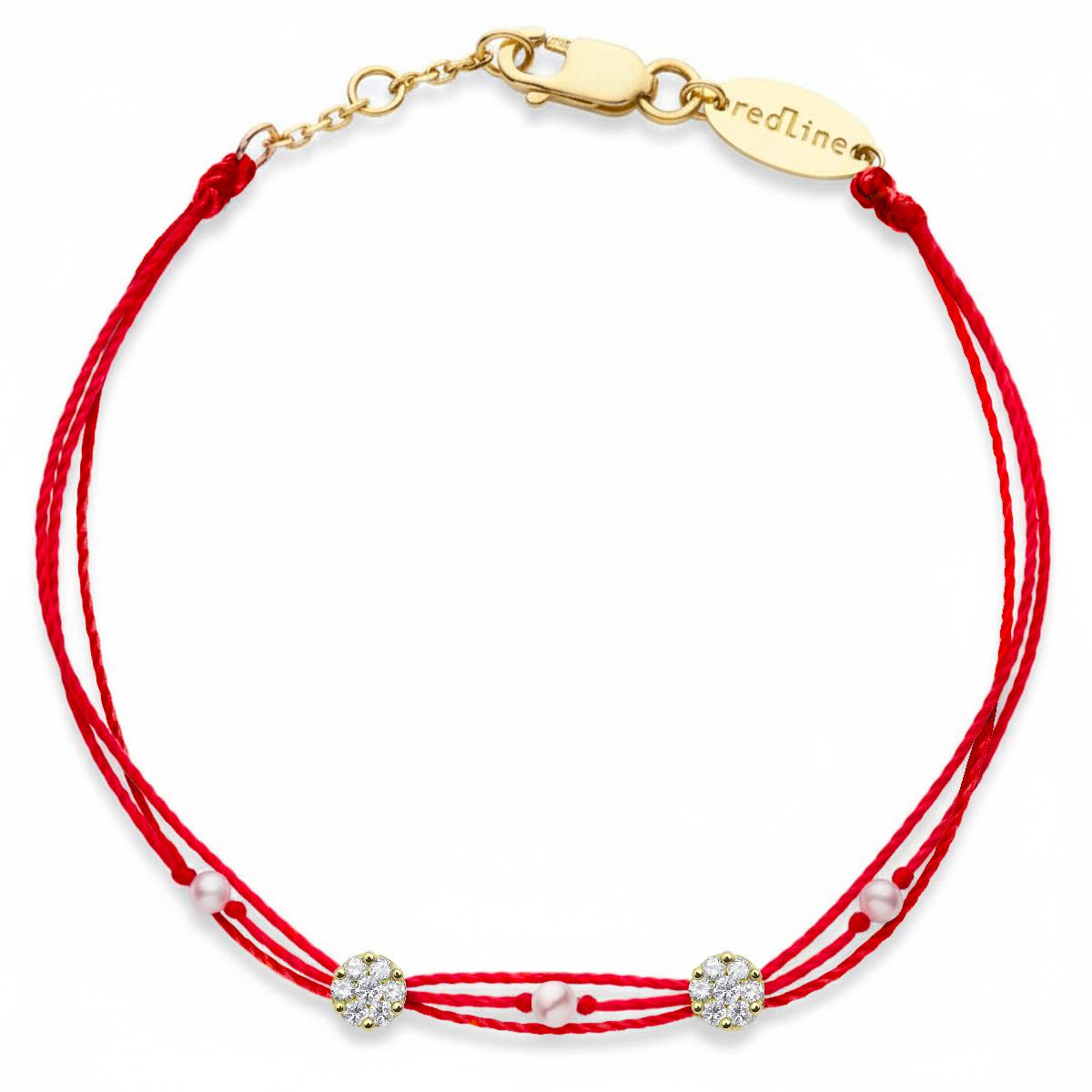¡Un diamante sobre un hilo, o dos! Dos monturas de diamantes Illusion (14 diamantes que forman 0.10 quilates en un juego de garras) están entrelazados con tres perlas donde se mezclan en tres hilos de colores. Un broche de oro de 18 quilates y una escala de tres anillos ajustarán el tamaño de tu joya. Deja volar tu imaginación escogiendo entre los 3 acabados de oro que tenemos y los 80 colores de hilo disponibles.