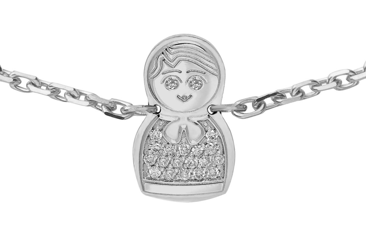 ¡Una bonita muñeca rusa en diamantes (0,20 quilates) combina tradición y refinamiento en esta joya original y preciosa! Un broche de oro de 18 quilates y una escala de tres anillos ajustarán el tamaño de la joya. Está disponible en oro blanco y oro amarillo.
