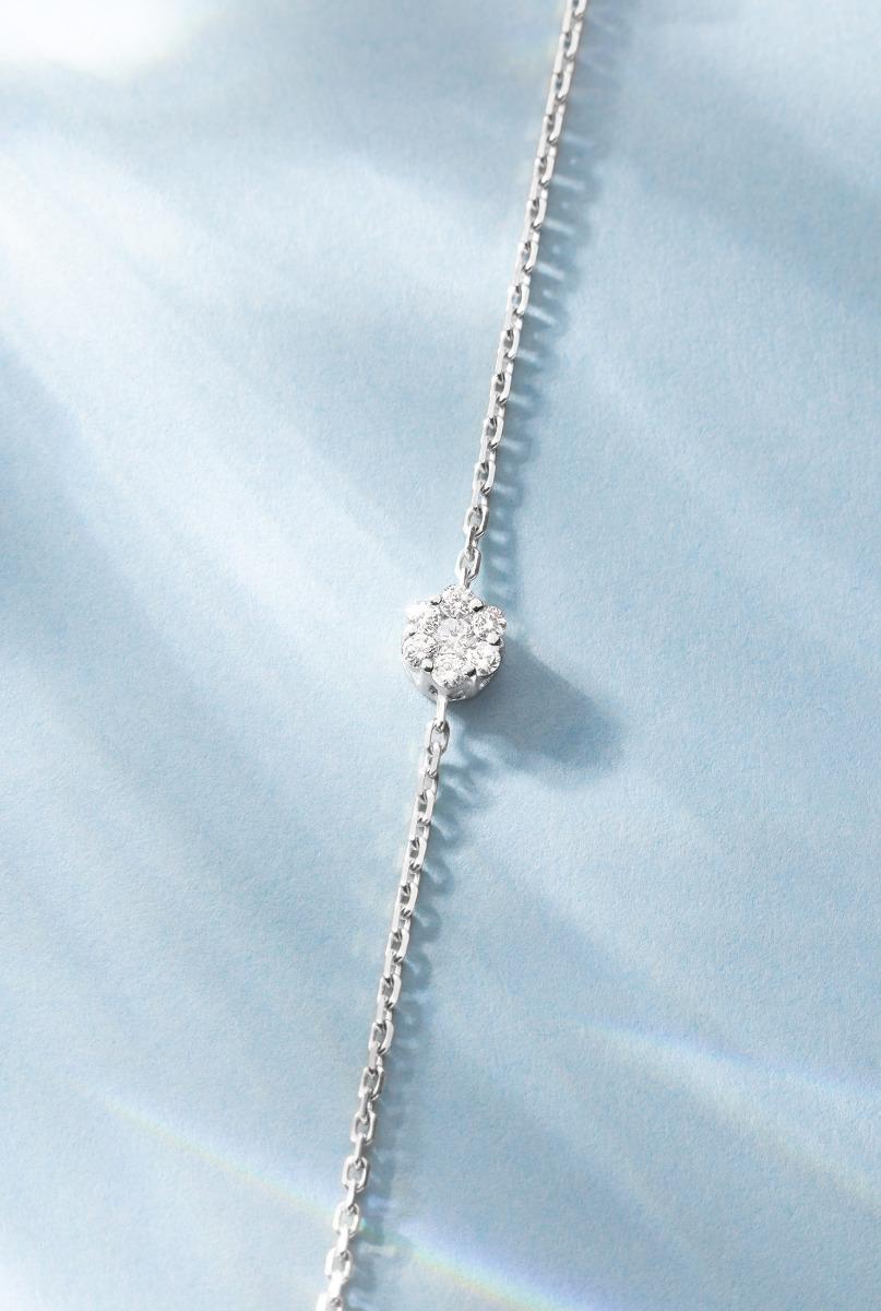 ¡Un diamante sobre una Cadena! sostiene sobre una garra casi invisible engastada en oro, 7 diamantes illusion blancos formando en total 0.10 ct que se posan de manera delicada pero imponente sobre una cadena 18k. Un broche de oro y tres anillos de 18 quilates están para ayudarte a ajustar el tamaño de tu joya. Disponible en 2 acabados de oro.
