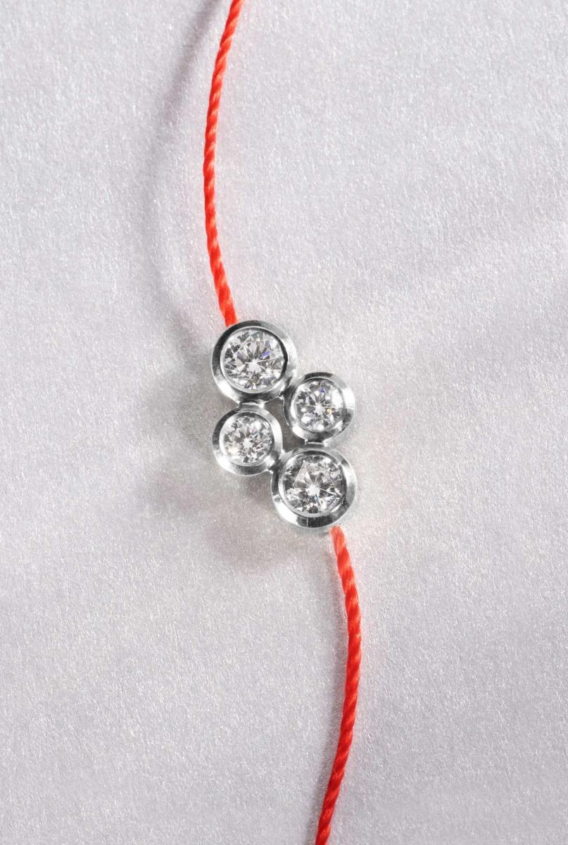 Cuatro diamantes para cuatro veces más brillo. Las cuatro piedras de esta pulsera se etrelazan entre sí (dos diamantes de 0,10 y dos de 0,05 quilates). El hilo insignia de la marca aporta un poco más de delicadeza a esta preciosa pieza. Un cierre y una escala de tres anillos en oro de 18 quilates ajustarán el tamaño de la joya a la perfección. Disponible en cuatro acabados de oro y 80 colores de hilo.