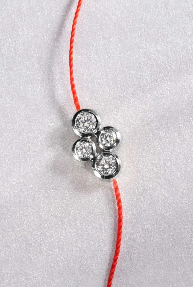 Cuatro diamantes para cuatro veces más brillo. Las cuatro piedras de esta pulsera se etrelazan entre sí (dos diamantes de 0,10 y dos de 0,05 quilates). El hilo insignia de la marca aporta un poco más de delicadeza a esta preciosa pieza. Un cierre y una escala de tres anillos en oro de 18 quilates ajustarán el tamaño de la joya a la perfección. Disponible en cuatro acabados de oro y 80 colores de hilo.