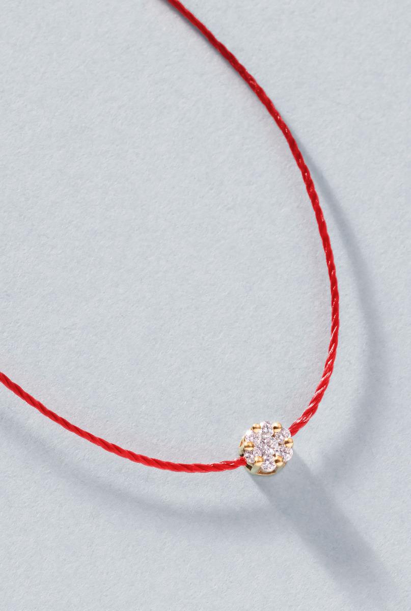 ¡Un diamante sobre un Hilo! sostiene sobre una garra casi invisible engastada en oro, 7 diamantes illusion blancos, formando en total 0.10 ct que se posan de manera delicada pero imponente sobre un collar hecho con el hilo insignia de la marca que seguramente hará resplandecer tu cuello. Un broche de oro y tres anillos de 18 quilates están para ayudarte a ajustar el tamaño de tu joya. Disponible en 2 acabados de oro.